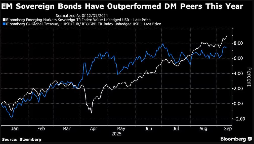 La deuda de los mercados emergentes ya ha proporcionado a los inversores una rentabilidad de casi el 9% este año, según un indicador de Bloomberg, frente a la ganancia del 7,5% de la deuda de los mercados desarrollados en el mismo periodo.